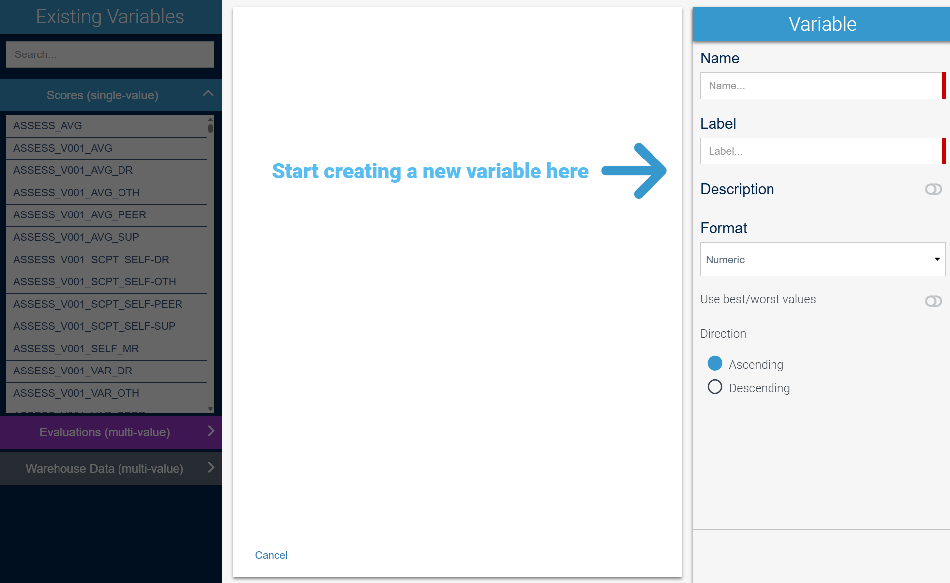 When creating a variable, choose between score-based or person-based logic, with support for numeric or time-based formats. This flexibility ensures your variables align with the type of data you need to analyze and track.